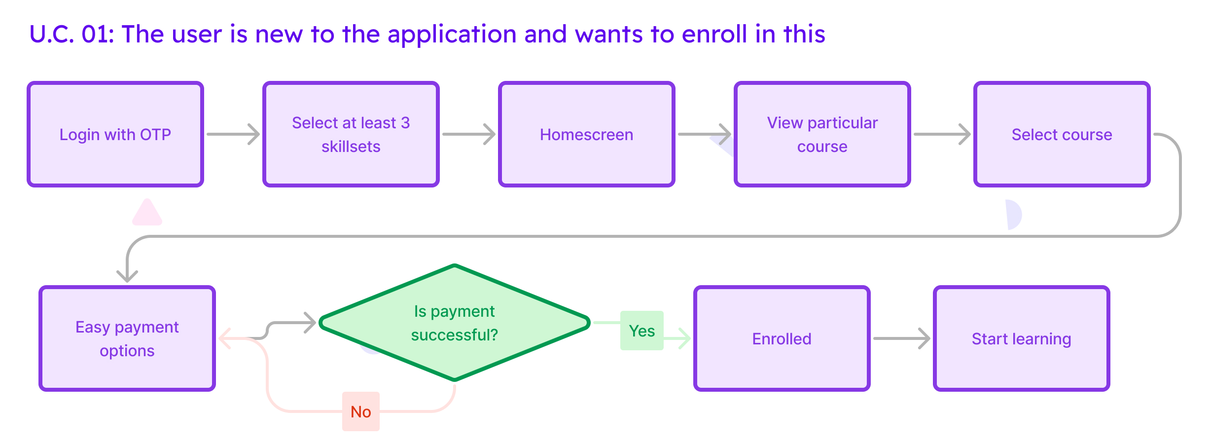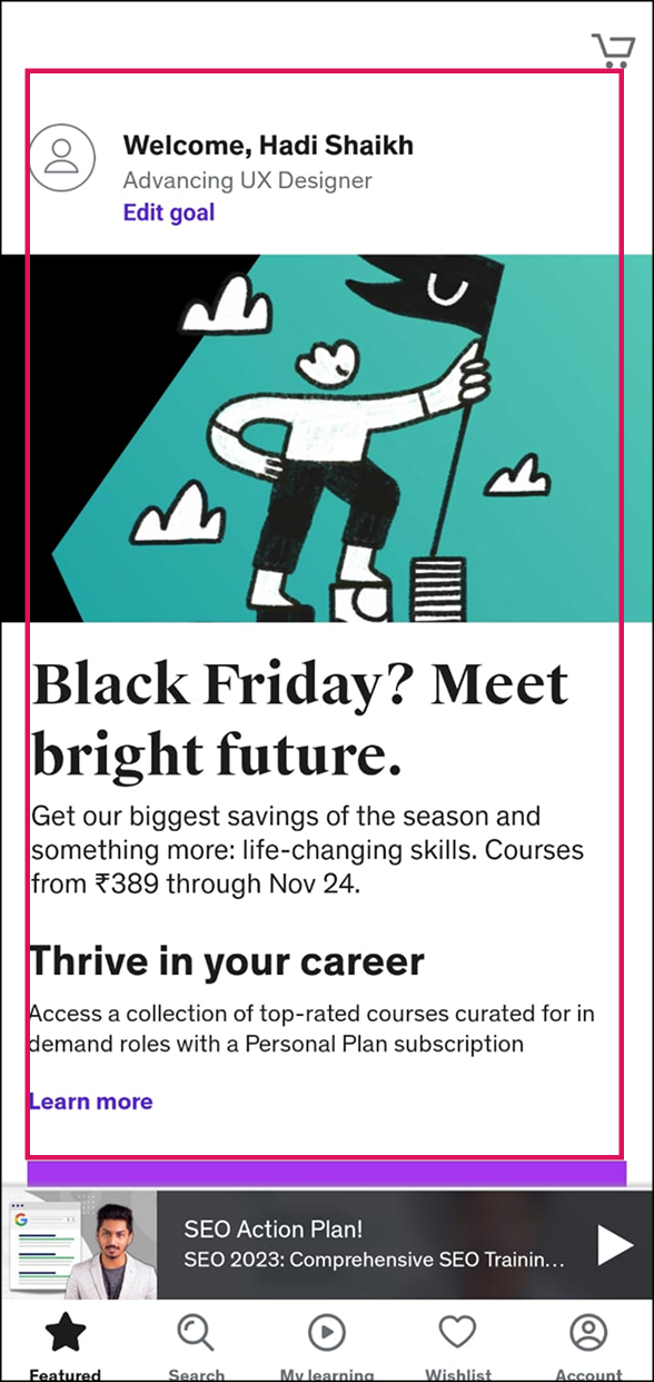 After dividing two user flows, primary and less prominent, I analyzed that the first page on which user lands on is feature page which look very similar to a webpage. If a user wants to purchase or enroll into any course, the user has either scroll down a lot or search for it which is really diverting the users’ cognitive focus.
